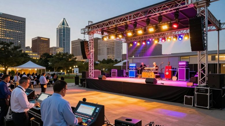 Their team provides professional audio, stage lighting, and video systems. They also provide reliable outdoor and portable stage rentals. This creates a seamless experience, so event planners focus on details, not logistics.